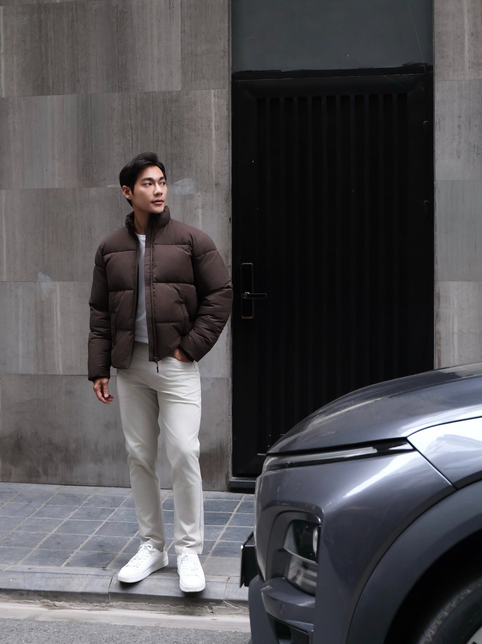 Thiết kế: Thiết kế túi hông tiện lợi, đường chần ngang, gam màu tối hiện đại